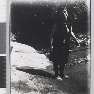 Charmian London stands with feet in creek on Jack London Ranch.