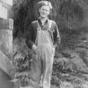 Photo--black and white: Karl Asman (1894-1945) in overalls circa 1919. Asman was married to Alice Riddell Asman (1902-1922) who was a granddaughter of Otis Allen.