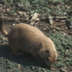 Close-up of prairie dog with its nose to the ground.