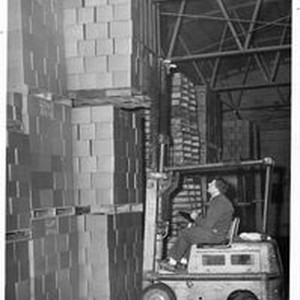 Photo, black and white: O. A. Hallberg & Sons Apple Products cannery in Graton, CA. Donald O. Hallberg on forklift 1955 in the cannery warehouse.