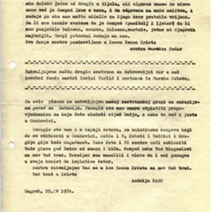 Circular letter for April 1974 containing short messages from sisters in Zagreb and a pastor Andrija Sabo thanking the women for their financial support to the churches. [Description English/roman)] Okružno pismo za travanj 1974. godine koje sadrži kratku poruku sestara iz Zagreba te zahvalu pastora Andrije Sabe za financijsku pomoć koje su žene dale crkvama. [Description (original non-English/roman language/script)]