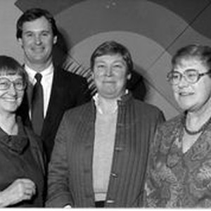 Photo--black and white: Palm Drive Hospital 20 Year service awards, 1984. Joan Coombes, RN, Eileen LuKas, RN, Mary Bryant, RN., and Richard Bracken, administrator.