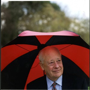 Color photo of Charles Handy with an umbrella; Photographs of Charles Handy by Elizabeth Handy; Drucker Archives; Box 8