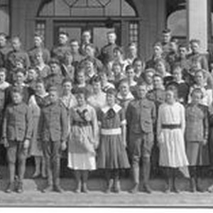 Photo--black and white: Analy Union High School class of 1921, sophomore year. The boys wear military-like uniforms. Photo by Clench Studio in Sebastopol.