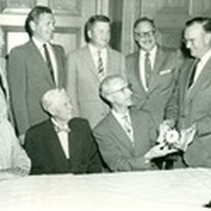 Lindstrom Testimonial; man receiving a clock, Mr. Whitsett sitting, County Supervisor Warren Dorn standing in background, second from right.