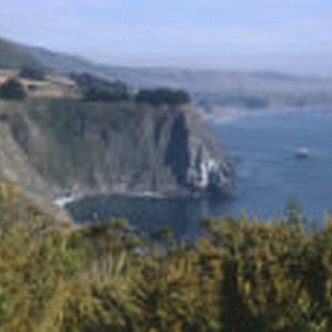 Thick brush partially obscures a secluded cove surrounded by steep cliffs on the California coast.