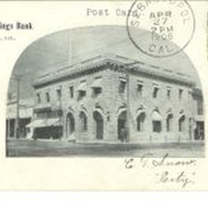 Postcard, photo--black and white: Business post card from Analy Savings Bank, dated 4-27-1906, 1 cent stamp, typed message on back that earthquake did not damage safe deposit boxes.