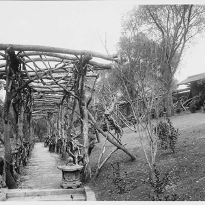 The wisteria pergola along the east ridge of the Japanese garden. The pergola is not yet covered in wisteria vines.
