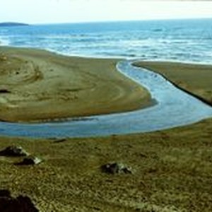 Slide, color transparency: Salmon Creek as it flows into the Pacific Ocean at Bodega Bay, April, 1983.