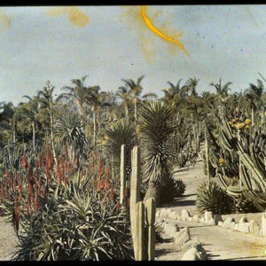 An autochrome view of a path in the desert garden. MS note on verso of plate mounting reads "Cactus garden, ca. 1924."