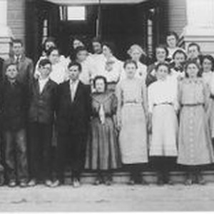 Postcard--photo black and white: New Sebastopol Grammar School, 1908 or 1909. Photo of 8th grade class standing on steps of school. One student identified--tall girl front center in light dress--Anita D. Laton. Other students mentioned: Hunt, Irma Strout, Clara Christiansen, and Adeline LeBrun.