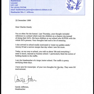 Correspondence from Carole Jefferson to Charles Handy praising his lectures. Jefferson particularly exalts a thought in which Handy recommends a trip to the theatre in place of SAT preparation for junior school students. She proceeds to highlight Handy's thought about lessons learned in kindergarten, and indicates that she has requested transcripts for Handy's two thoughts for the day.