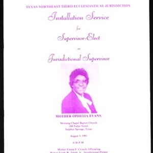 Installation service program, Ophelia Evans, as Supervisor-Elect as Jurisdictional Supervisor, Texas Northeast Third Ecclesiastical Jurisdiction, Church of God in Christ, Morning Chapel Baptist Church, Sulphur Springs, Texas, 1991 August 3. [Description English/roman)]