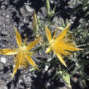 Close-up of two yellow flowers above rocky ground.