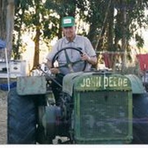 Photo--color: Tom Marshall of the Marshall Ranch in Sebastopol at Ponte's Tractor Show. Tom sits on his John Deer tractor. Circa 2000s.