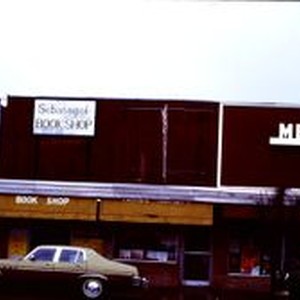 Slide, color transparency: Downtown Sebastopol, 1977. The Sebastopol Book Shop and Medico Drug store on North Main Street.