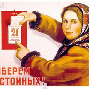 Soviet poster dedicated to the 1947 elections for the local and state Soviets (i.e. councils). Caption reads, "Выберем достойных! / Vyberem dostoinyh!", meaning, "Let's elect the worthy ones!". [Description English/roman)]