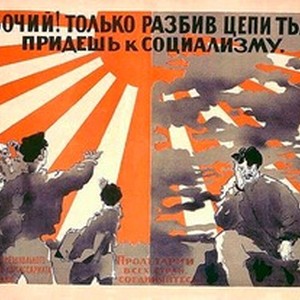 A poster propagandizing literacy and education. Caption reads, "Rabochii! Tol'ko razbiv tsepi t'my, pridesh' ty k sotsializmu / Рабочий! Tолько разбив цепи тьмы, придешь к социализму", meaning, "Worker! The only way to reach socialism is to brake the chains of darkness". [Description English/roman)]