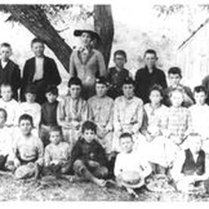 Photo, black and white: Unidentified group of elementary students with teacher, probably from a rural school circa 1900.