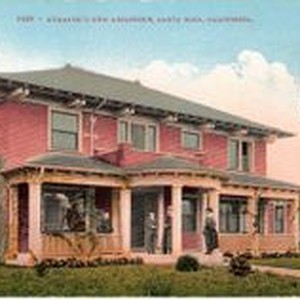 Postcard -hand colored photo: Burbank's 'new' residence in Santa Rosa with Burbank on front porch facing the street with hat and his wife and two unidentified men. Oval insert of Luther Burbank in upper right corner. Burbank had this house build in 1906 on Tupper Street which is across from his original Greek Revival "Luther Burbank Home." The Tupper Street house was removed in the late 1960s for other development. Caption: "2429--Burbank's new residence, Santa Rosa California." Edward H. Mitchell postcard No. 2429