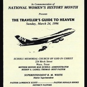Program for the play "The traveler's guide to heaven", Texas southeast, Echols Memorial Church of God in Christ, Waco, Texas, 1996 March 24. [Description English/roman)]