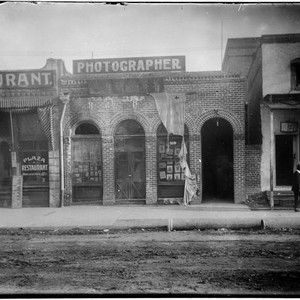 Storefront has sign in English that says "Photographer" and a sign in Chinese that translates to Jinghua Photo Studio. [Identification of item]. Lisa See collection. The Huntington Library, San Marino, California.
