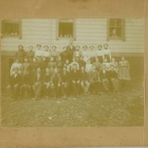 Photo--sepia: Sebastopol Grammar School class photo taken in early 1900. Male teacher standing in rear, girls standing, boys seated in front. It was located on Bodega Avenue where Parkside School is currently situated (7450 Bodega Avenue)