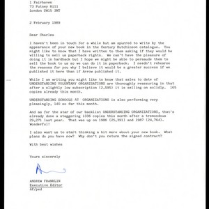 Correspondence from Andrew Franklin to Charles Handy concerning the publication of Handy's book. Franklin informs Handy that he has written to Century Hutchinson asking if they would be willing to sell Penguin paperback rights. Franklin also informs Handy on the sales performance of his books, "Understanding Voluntary Organizations" and "Understanding Schools as Organizations".