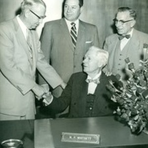 Mr. Whitsett, siting, shaking hands with a man, two other men standing; Valley Federal Savings and Loan.