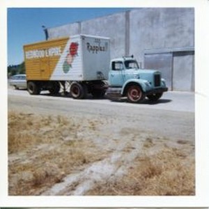 Photo, color: O. A. Hallberg & Sons Apple Products cannery in Graton, CA. Redwood Empire Apple Products truck with the sign "Rapples" stands beside the cannery. July, 1963