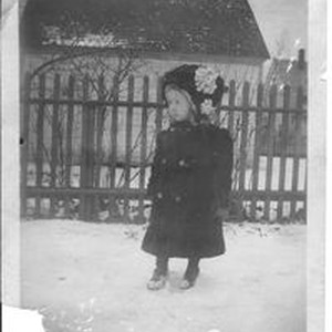 Photo--black and white: Bunni Cornelia E. Myers (1906-2001) photo as a young girl in winter coat and hat standing outside in the snow about 1914.