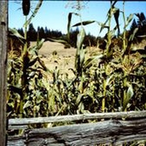 Slide, color transparency: Sonoma County scene--unidentified ranchland seen through fence and corn stalks.