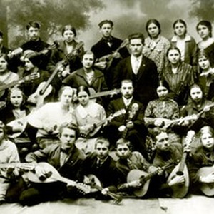 A photograph showing members of a plucked instrument orchestra at the House of the New Testament, 1929. [Description English/roman)]