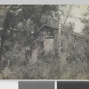 Side and roof of wood frame house visible over trees and forest foliage. Title and date transcribed from envelope. Verso of photo reads: "'Jack's House' at Wake Robin."