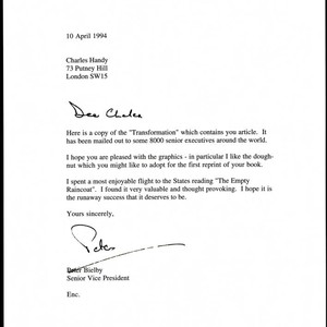 Correspondence from Peter Bielby to Charles Handy enclosing a copy of the "Transformation" which contains Handy's article. Bielby proceeds to state that the article has been mailed out to approximately eight thousand senior executives around the world. Reflecting on Handy's book, "The Empty Raincoat," Bielby closes the letter complimenting Handy, relating that he found the book thought provoking and valuable.