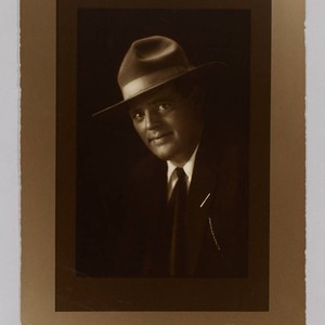 A chest-length studio portrait of Jack London against a dark background. London is wearing a dark suit and tie and a broad brimmed hat. His head is tilted to the left, and he has a chain attached to his left lapel. "H.H. Morris ; Galveston, Tex." embossed on the mount, below the photograph. Title devised by cataloger, date based on an identical, but larger, print that is in JLP 538 LA 7 (p. 19).