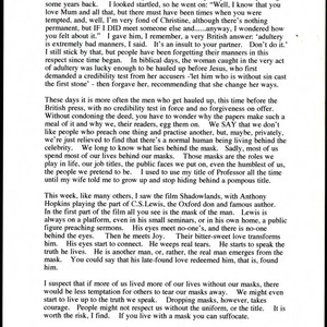 Thought for the day by Charles Handy on living truthfully, without masks or other props, and accepting the consequences. Handy begins the thought discussing how his son approached him with questions concerning adultery and what to do about it should temptations arise, with Handy relating that it is a show of bad manners to one's partner. After discussing the biblical story of Jesus telling an adulterous woman to go and sin no more, he notes that it is often men who receive public scrutiny and shaming for their offensive deeds in modern society. He proceeds to highlight how the public longs to look behind the masks of celebrities, and how most people live behind their masks, recalling the film, "Shadowlands," and how it's about a person finally removing his mask. He concludes that if more people lived without their masks, there would be less temptation for others to tear away their masks, and people might be able to start to live up to their expressed truths.