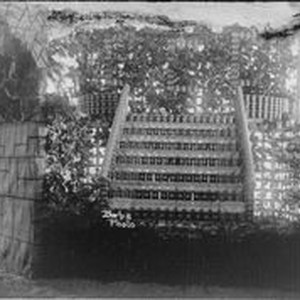 Negative glass-plate photo: From a glass plate negative made by William Borba. Gravenstein Apple Show exhibit circa 1915 in Sebastopol. Large unidentified display with jars or cans made into a stairway.
