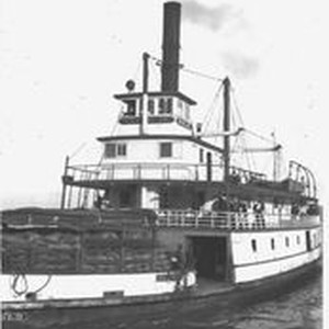 Photo--black and white: The paddle-wheel steamer "Gold." The paddle-wheel was owned by the P&SR railway and was used to haul Sonoma County fruit, eggs, milk and lumber from the end of the P&SR line in Petaluma to its docks and on to San Francisco.
