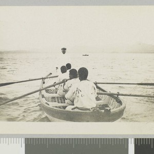 Ship captain stands in a skiff with four oarsmen rowing in open water.