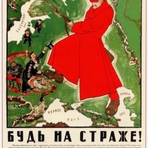 A posted dedicated to the Red Army. Caption reads, "Bud' na strazhe! / Будь на страже!", meaning, "Stay alert!" [Description English/roman)]