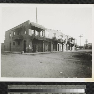 View of attached two-story brick buildings, some with balconies, on Juan Street in Old Chinatown, Los Angeles. There is a fire hydrant at the corner of the street. Title supplied by cataloger; title partially illegible.