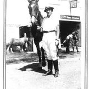 Photo, black and white: Woman in riding apparel holding reins of horse standing in front of J.N.Vail Riding Academy of Santa Rosa. Sign hangs above doorway "Saddle Horses for Hire." Handwritten on back: "Ruth, Santa Rosa, Calif. June 1934."