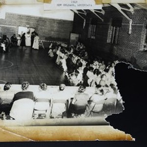 Damaged photograph of a large group of women at the first regional workshop, Church of God in Christ, New Orleans, Louisiana, 1949. "Hill's Studio, Birmingham, Ala." -- stamped on back. [Description English/roman)]