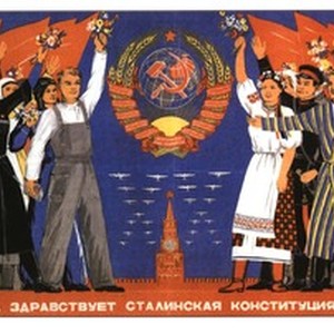 A poster dedicated to adoption of 1936 Soviet constitution (aka "Stalin constitution") on December 5, 1936. Caption reads, "Da zdravstvuet stalinskaia konstitutsiia! / Да здравствует сталинская конституция!", meaning, "Long live the Stalin constitution!". [Description English/roman)]