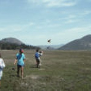 Students flying a kite in the Morro Bay salt marshes. Students listed on slide mount are: John W, Juliana Van C, John H, and Julie H.