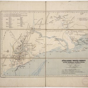 Kirkpatrick Catalogue entry: "2440 Gross, R. Südliches Wolta-Gebiet auf der Goldküste von West-Afrika, nach den Angaben der Missionare Locher & Plessing. [n.p.], Rudolf Gross, [after 1855]. 1 sheet. [see p.]."This is the south coast of present day Ghana.Possibly removed from Joseph Josenhans' Atlas der Evangelischen Missions-Gesellschaft zu Basel. Probably acquired while Burton was British consul at Fernando Po, from 1861 to 1864. Stamp: Hensington Public Libraries. Prime meridian: GM. Relief: shaded. Graphic Scale: Miles. Projection: Cylindrical. Printing Process: Lithography.