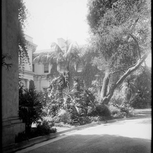 View from the porte cochère to the thick vegetation immediately to the north of the Huntington residence. MS note on verso reads "HEH grounds: drive and residence, with rockery."