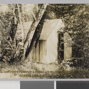 A one room, wooden guest house in a grove of trees. Title and date transcribed from envelope. Photo has been made into a postcard. Print on front of photo reads: "Jack London's first quarters at Wake Robin Glen Ellen Cal."