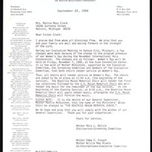 Mary L. Belvin & Emma F. Crouch (Church of God in Christ. Women's International Convention), 412 Sanford Avenue, Richmond, California (P.O. Box 1685, Memphis, Tennessee), letter, 1986 September 22, to Anna B. Ford, 1431 South Christiana, Chicago, Illinois. Copy 2. [Description English/roman)]